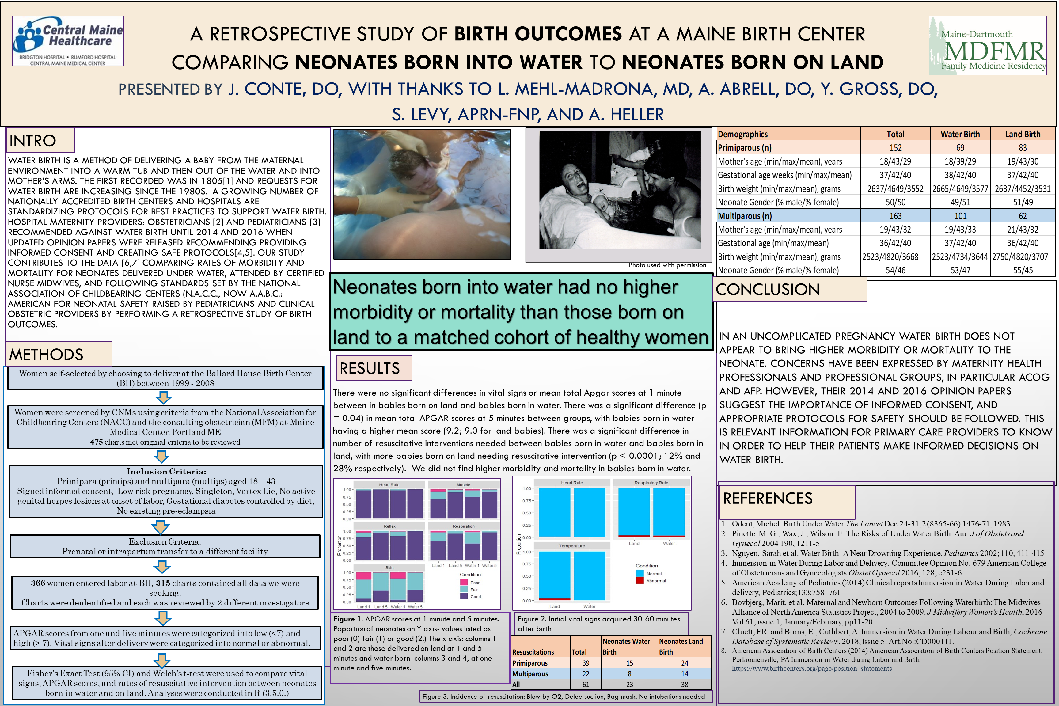 A retrospective chart audit of women giving birth in water with a matched cohort who birthed on land and their neonatal outcomes. Population studied: Women of child bearing age between 18 and 45 meeting low-risk pregnancy criteria as designated by the standards set by A.A.B.C (American Association of Birth Centers.) All deliveries were completed at a freestanding birth center in Portland, Maine between 1999 and 2008.